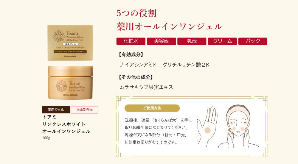 シワを改善する。メラニンの生成を抑え、しみ、そばかすを防ぐ。肌あれ、あれ性。日やけ・雪やけ後のほてりを防ぐ。あせも・しもやけ・ひび・あかぎれ・にきびを防ぐ。油性肌。かみそりまけを防ぐ。肌をひきしめる。肌を正常にする。肌を整える。皮膚をすこやかに保つ。皮膚にうるおいを与える。