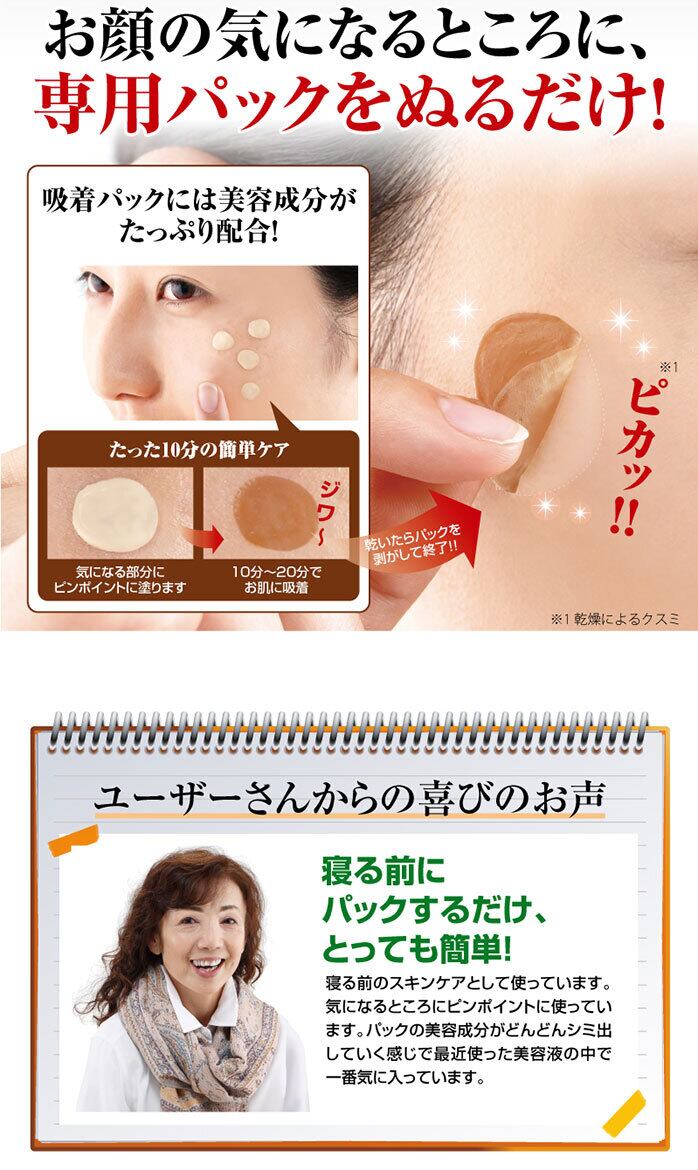 夜のスキンケアとして、洗顔後、化粧水などで肌を整えた後にご使用ください。気になる箇所に本製品を適量塗り、10〜20分程度放置して乾かしてください。