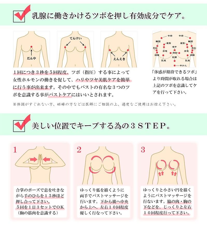 バストまわり全体を両手で下から横、上へと円を描くように、優しくマッサージするように塗ってください。シャワーや入浴後の清潔な肌にお使いください。