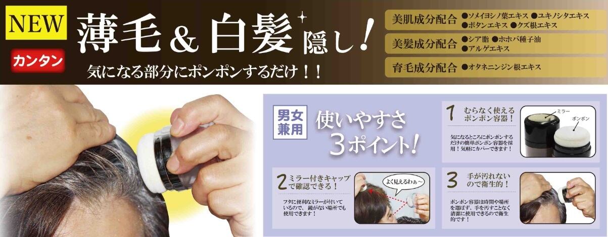 白髪隠し 頭皮ファンデ 薄毛隠し ボリュームアップ ポンポンファンデ 生え際カバー ウォータープルーフ ヘアファンデーション 白髪染め 黒髪 白髪カバー 白髪染めトリートメント 白髪染めシャンプー 髪 ハリ コシ ヘアカラー 育毛