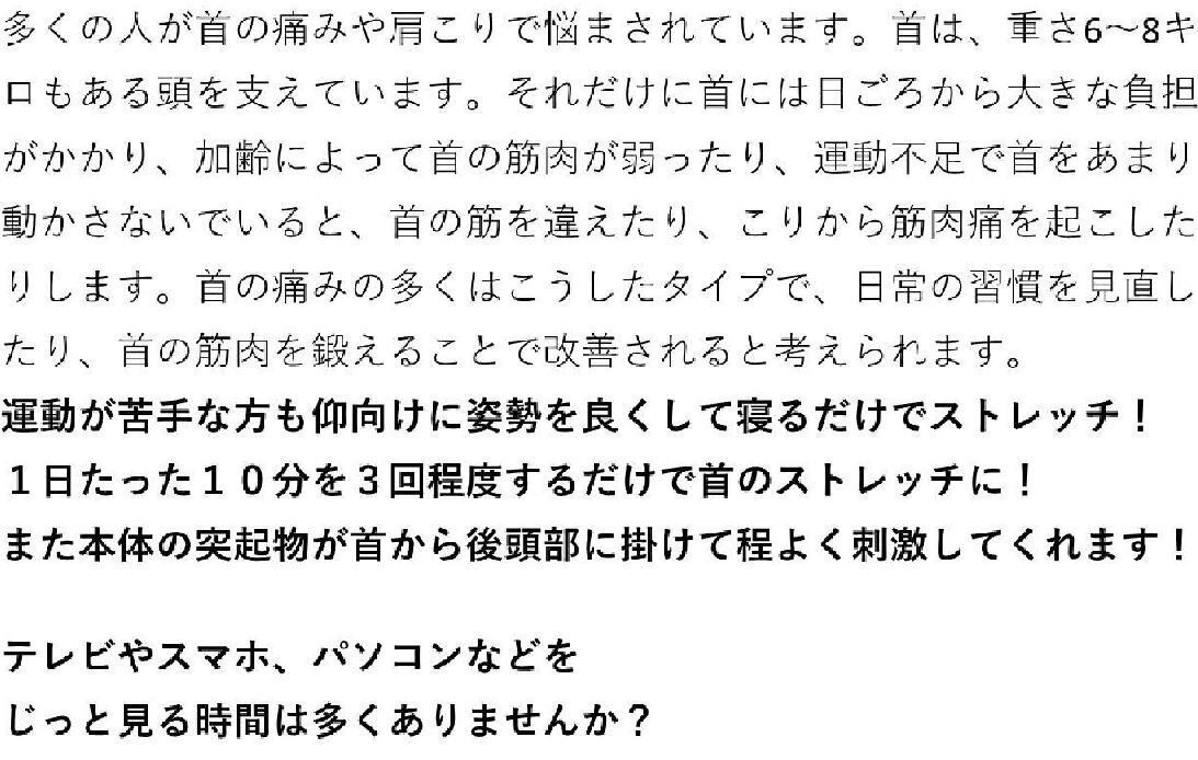 1回10分、仰向けに寝るだけで首と肩をリフレッシュできるストレッチアイテムです。