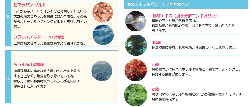 水、セタノール、シア脂、BG、ベヘントリモニウムクロリド、トリ(カプリル酸/カプリン酸)グリセリル、カプリル酸ヤシ油アルキル、ステアルトリモニウムクロリド、海塩、海水、ローズ水、ヒアルロン酸Na、加水分解コンキオリン、褐藻エキス、紅藻エキス、緑藻エキス、チャ葉エキス、塩化Na、炭酸Ca、炭酸Mg、炭酸K、ポリクオタニウム-10、パンテノール、オリーブ油、アルガニアスピノサ核油、オニサルビア油、イランイラン花油、タウリン、リシンHCl、グルタミン酸、グリシン、ロイシン、ヒスチジンHCl、セリン、バリン、アスパラギン酸Na、トレオニン、アラニン、イソロイシン、アラントイン、フェニルアラニン、アルギニン、プロリン、チロシン、イノシン酸2Na、グアニル酸2Na、ベタイン、グアーヒドロキシプロピルトリモニウムクロリド、トコフェロール、香料、イソプロパノール、メチルイソチアゾリノン、フェノキシエタノール