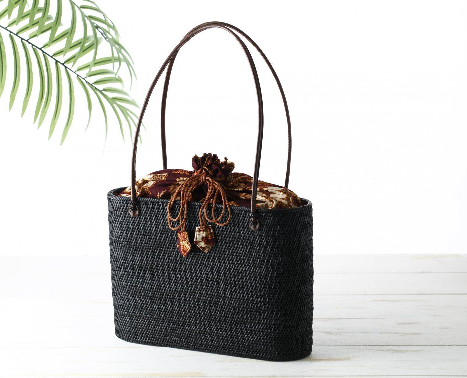 アタバッグ トートバッグ ブラック バリ島 カゴバッグ 手編み 伝統工芸 天然素材 浴衣バッグ 籠 和装小物 夏バッグ 巾着付き プランドゥ ハンドメイド リュック 手提げ バッグ 祭り 浴衣 鞄 カバン 手提げかばん
