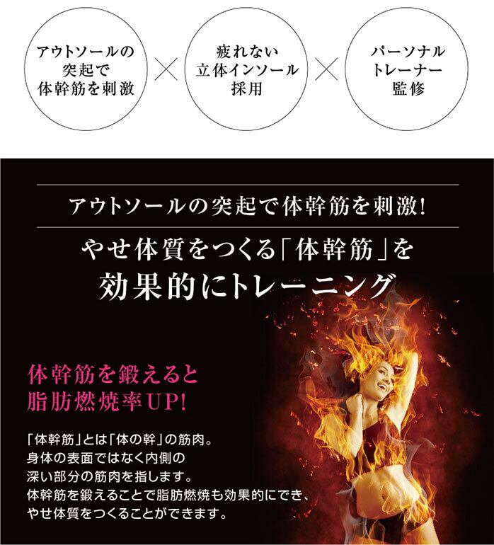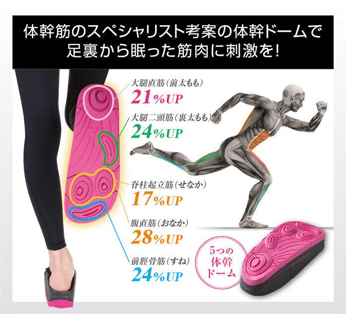 独自の厚底あおりソールが、歩行時にあえて不安定な状態を作り出し、バランスを取ろうとする力でお腹や美脚に欠かせない体幹筋を活性化。